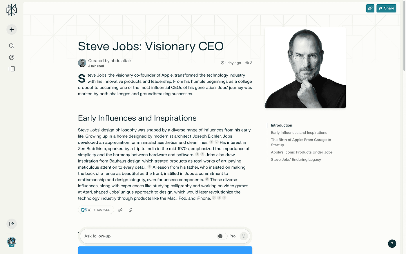 Perplexity’s core product is an advanced answer engine that combines a search engine’s functionality with an AI chatbot’s conversational abilities. The platform uses advanced AI to search the internet in real time for answers with footnotes linked to the original sources, ensuring credibility. Additionally, the system measures previous queries within a conversation, enabling seamless follow-up questions. From a technical perspective, Perplexity uses multiple large language models and employs retrieval-augmented generation (RAG) to access and process up-to-date information from the internet.