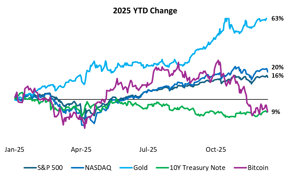 - Asset class performance reflected the uncertain environment. Gold led the way, surpassing $4,000 per ounce for the first time on October 10 and closing the year up 63%.