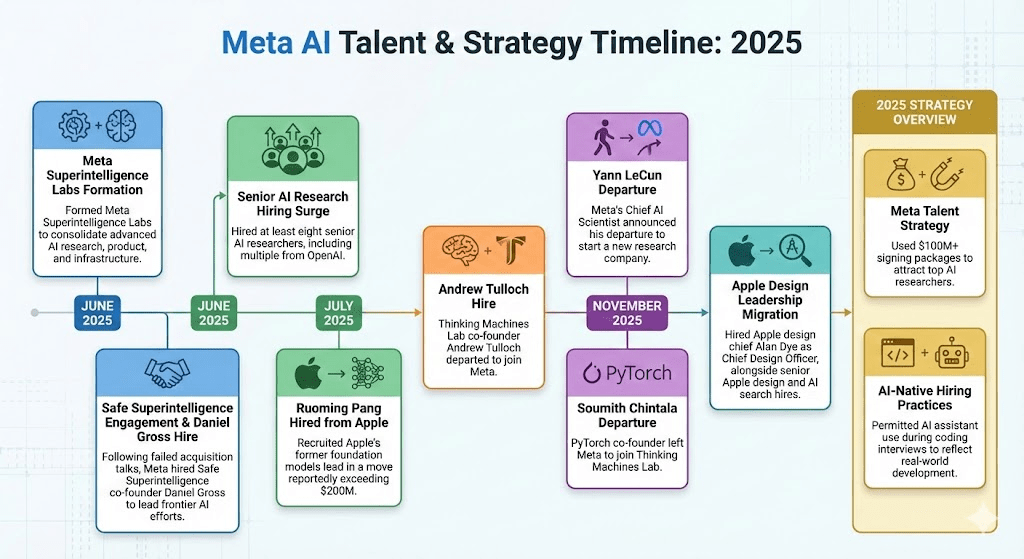 - Andrew Tulloch Departure and Re-Hire (October 2025): Co-founder of Thinking Machines Lab, who rejected a compensation offer reportedly reaching $1B in August 2025, Andrew Tulloch was reported by The Wall Street Journal in October 2025 to be departing the startup to join Meta, as revealed in an internal message announcing his exit.