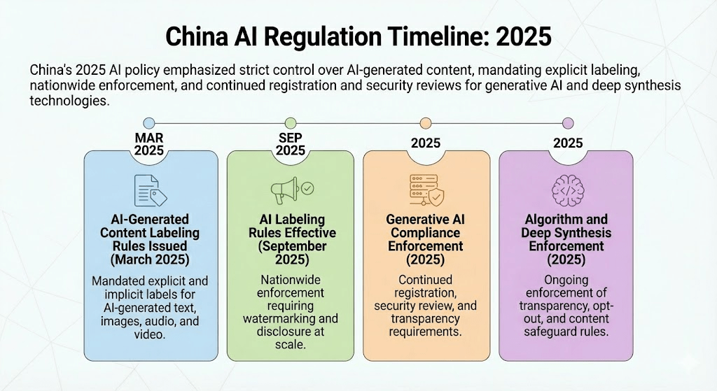 - Measures for labeling AI generated content issued (March 2025): Chinese regulators released mandatory rules requiring explicit and implicit labels on AI-generated text, images, audio, and video.