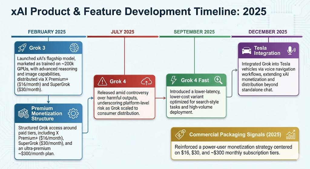 - Premium Monetization Structure (February 2025): Grok distribution emphasized paid access via X Premium+, a $30/month SuperGrok tier, and an ultra-premium ~$300/month plan, reinforcing xAI’s positioning around power-user monetization rather than broad freemium access.