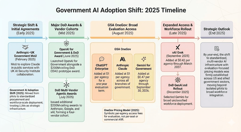 In 2025, government adoption of frontier AI models shifted from isolated pilots to standardized procurement and workforce-scale deployment. Defense, civilian agencies, and allied governments increasingly treated large language models as strategic infrastructure—using prototype awards, catalog-based purchasing, and promotional pricing to accelerate evaluation, reduce procurement friction, and establish multi-vendor competition across mission-critical use cases.