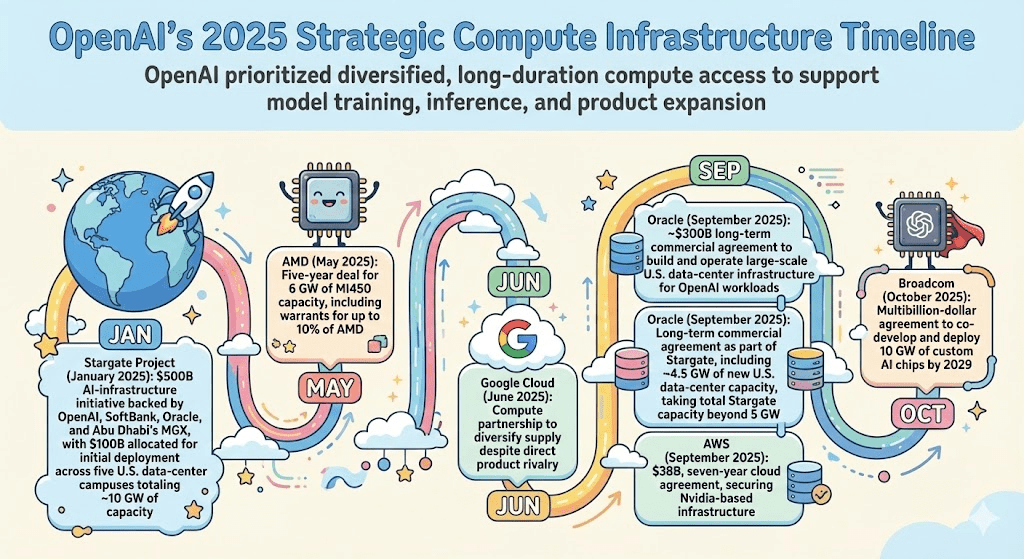 AI infrastructure became a primary arena for scale advantages in 2025, with neoclouds using IPO proceeds, long-dated capacity leases, and vertical integration attempts to lock in power, land, and GPUs. The year’s highest-signal moves centered on CoreWeave’s public-market financing and contract stack, the durability of hyperscale demand signals, and the emergence of alternative capacity providers (including Nebius) as capital formation accelerated across the GPU supply chain.