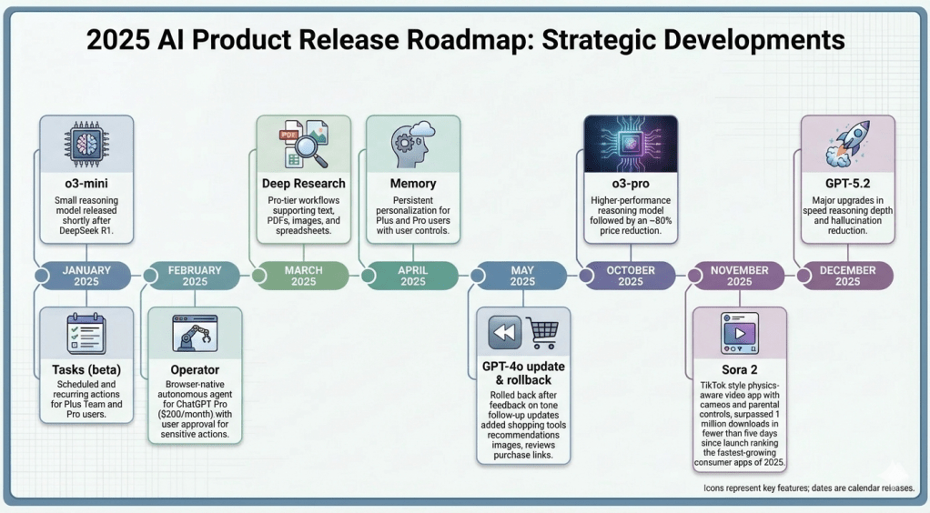 OpenAI expanded ChatGPT into a multi-modal, agentic, and monetized platform through a steady cadence of launches, positioning it as both a consumer assistant and an enterprise workflow layer.