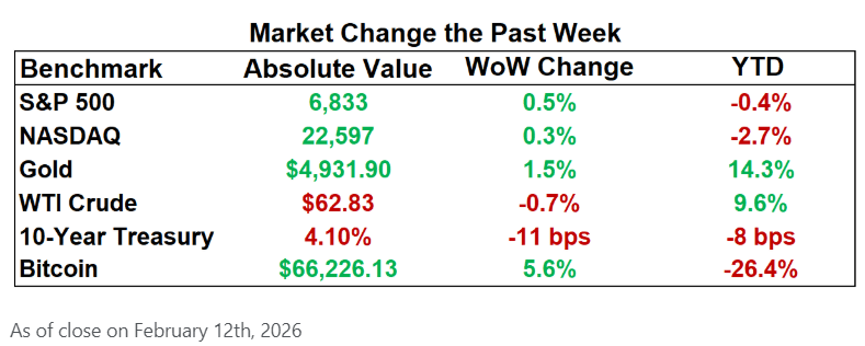 Markets opened with a welcome inflation surprise: January CPI rose just 2.4% y/y (vs. 2.5% expected), the lowest since May 2025, with core at 2.5% as cooler shelter and energy prints pushed June rate-cut odds to 83%. That followed a hotter labor report, 130,000 jobs added vs. 75,000 expected, and unemployment at 4.3%. In tech, AI capex scrutiny erased over $1T in Big Tech value after Amazon projected ~$200B in 2026 spending, pressuring Microsoft, Nvidia, and Oracle; alongside Alphabet and Meta, the group now signals ~$650B in 2026 AI data-center capex (~60% YoY), driving debt issuance and infrastructure strain. Apple fell 5% on reported Siri AI delays and FTC scrutiny. In the consumer-adjacent space, SpaceX reframed its vision toward a self-growing Moon city to bolster its IPO narrative. Semis continue their march toward $1T in 2026 sales (from $791.7B in 2025, +25.6%), led by advanced computing chips (+39.9%).