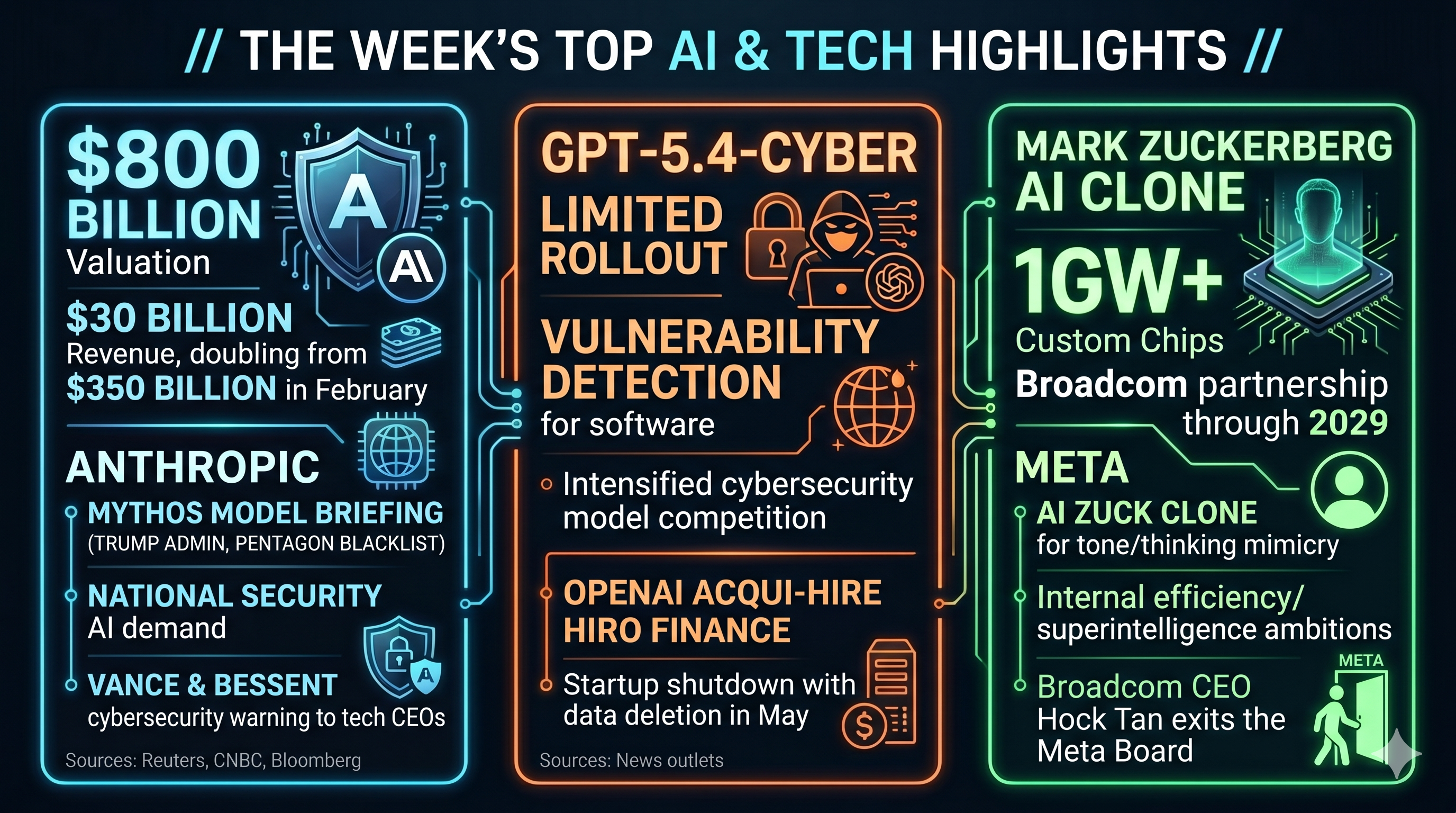 [1] 📈 Anthropic is briefing the Trump administration on the frontier model Mythos despite a Pentagon blacklist, highlighting national-security demand for advanced AI; separately, Vance and Bessent privately warned tech CEOs about cyber risks before Mythos’s launch. The company is also drawing investor offers valuing it near $800 billion, over double February’s $350 billion, as revenue growth to $30 billion intensifies competition with OpenAI, though funding terms remain uncertain. More from Reuters and CNBC on Mythos and cybersecurity, and Bloomberg on the company’s new valuation.